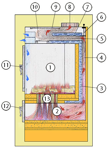La stufa WALLTHERM AIR è un generatore di calore ad aria alimentato a legna o a bricchetti di legna vergine pressati che combina le caratteristiche di una stufa a legna con la tecnica avanzata della combustione a gassificazione con fiamma inversa. Conosciuta anche come “stufa a doppia combustione” si può considerare principalmente costituita da una camera di combustione primaria, posta nella parte in alto, che dopo l’inversione della fiamma, funge da deposito del combustibile e una camera di combustione secondaria inferiore, posta sotto la prima. E’ in questa seconda camera, rivestita completamente in refrattario, che avviene il vero e proprio processo di gassificazione e con un coefficiente di rendimento altissimo >87% per una stufa a tiraggio naturale, ne sono testimonianza le basse temperature dei fumi di scarico <180°C.